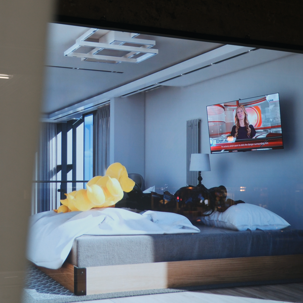 Description: An immersive installation exploring themes of media and constructed realities through a combination of animatronics, video, and large-scale printed visuals.